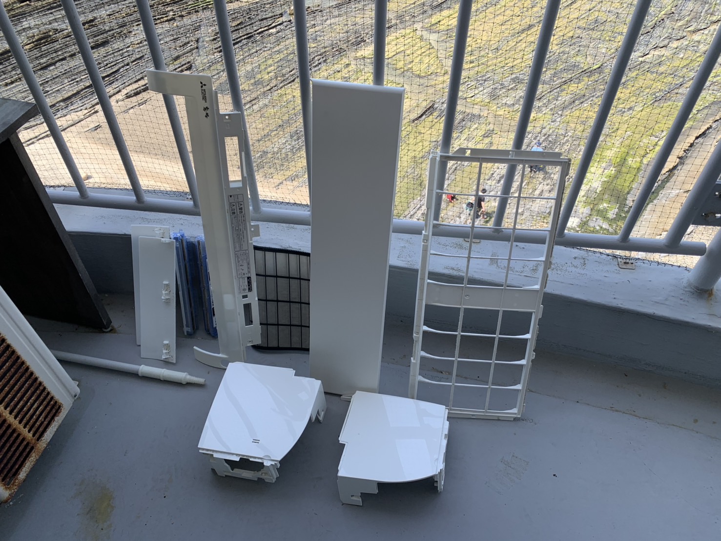 エアコン周辺の養生をすませ、前面パネル・フィルターをはずします。