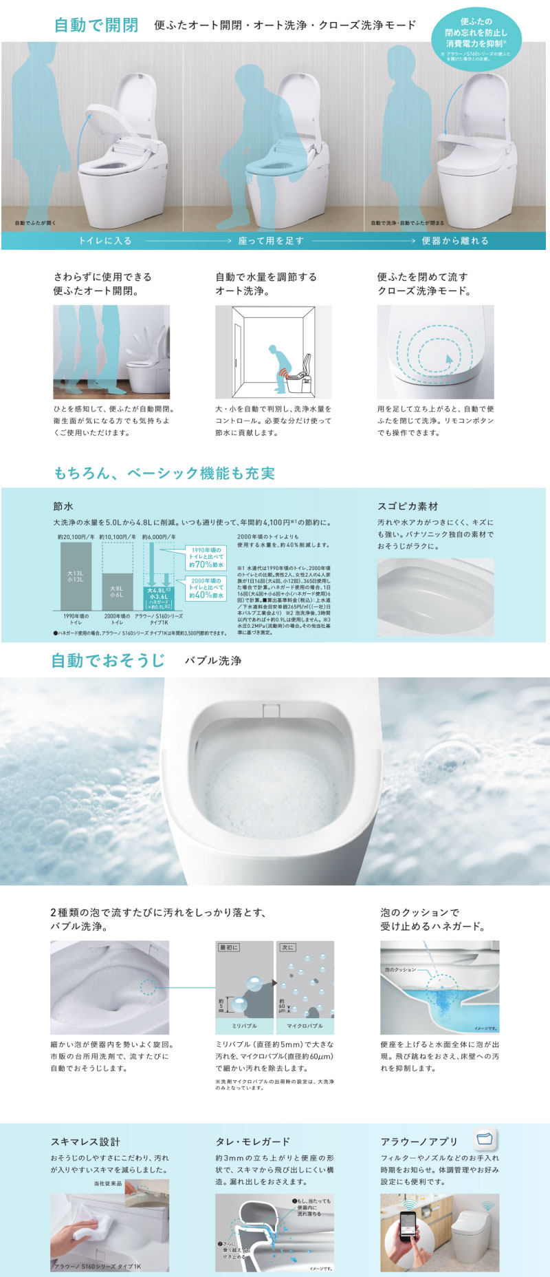 ボタン操作などで便座を上げると水位が下がり、水面全体に泡が出てきます。泡でトビハネをおさえ、床や壁などへの汚れを抑制します。