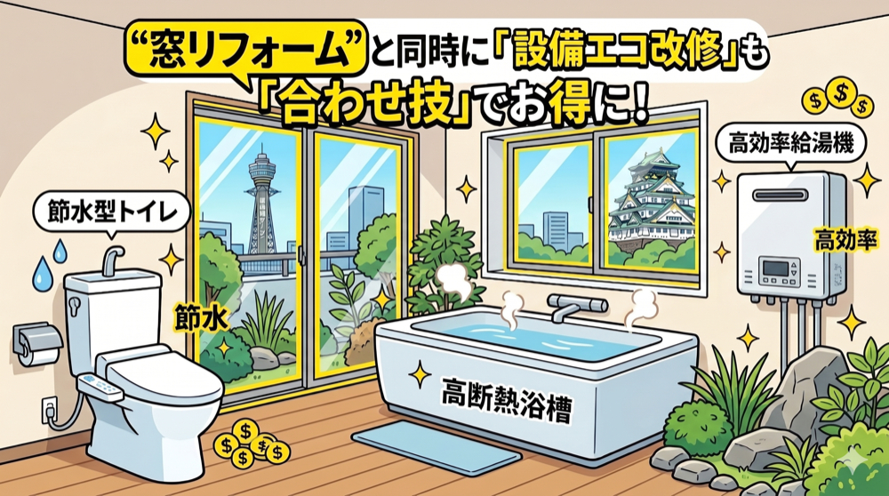 先ほど「設備だけの交換は対象外」とお伝えしましたが、必須条件である「窓の断熱改修」を行う場合、それに合わせて**「節水型トイレ」「高断熱浴槽」「高効率給湯機」などの設備効率化工事にかかる費用も、補助対象に含めることができます**(※窓・躯体等の改修工事費の合計額が上限) 。