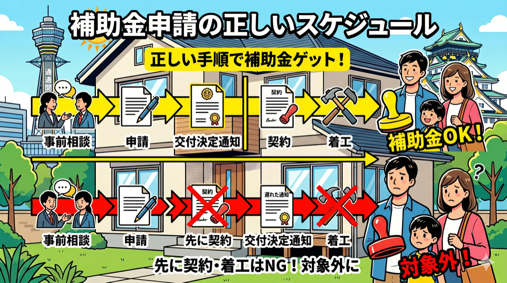 最も失敗しやすい落とし穴がスケジュールの問題です。 この補助金は、大阪市から「交付決定通知」を受け取った後に、工事業者と契約を結び、着工しなければなりません 。先に契約をしてしまったり、すでに工事を始めていたりする場合は、どんなに良いリフォームでも対象外になってしまいます 。必ず事前にご相談ください。
