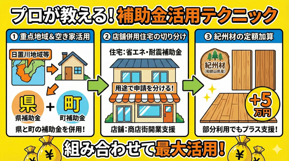 1階が店舗、2階が住宅というケースでは、店舗部分に「商店街開業支援(100万円)」を、住宅部分に「省エネ・耐震補助金」をそれぞれ適用できる可能性があります 。このように工事箇所を切り分けて考えるのがコツです。