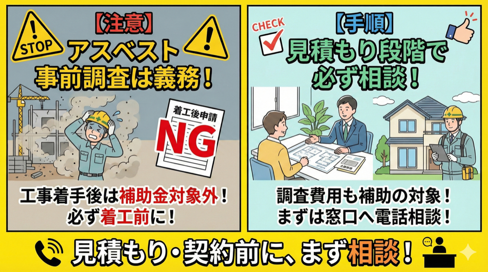 2022年からの法改正により、リフォーム時には必ずアスベストの事前調査が必要です 。 県や国では、この調査費用自体を補助する制度(全額補助など)を用意していますが、工事着手後の申請は一切認められません 。必ず見積もり段階で調査費用の補助についても相談しましょう 。