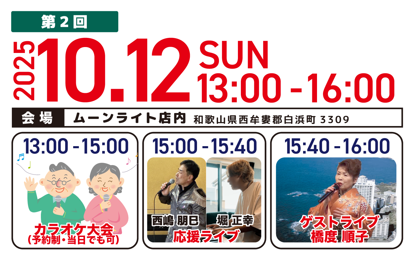 | 場所 | ムーンライト店内 住所:〒649-2326 和歌山県西牟婁郡白浜町3309 | ||